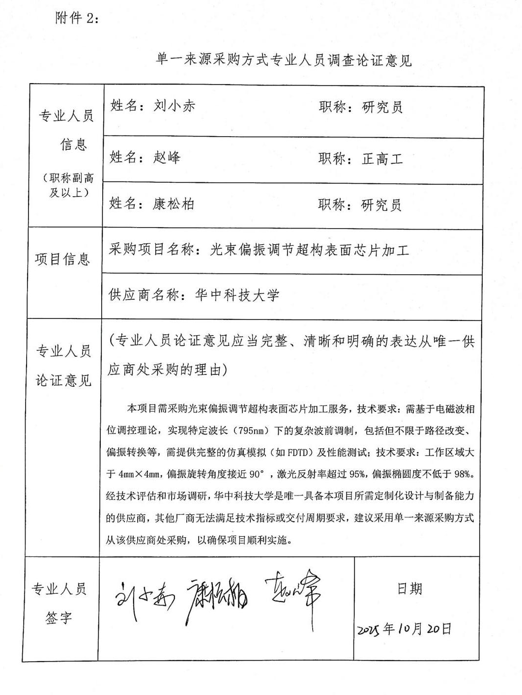 中国科研实验室精密测量科学与技术创新研究院关于向华中科技大学采购光束偏振调节超构表面芯片加工的单一来源公告